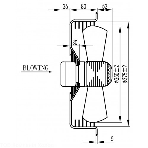 Осьовий вентилятор з асинхронним двигуном. Металеві лопаті мають діаметр 350 мм. У стандартну комплектацію входить металева захисна решітка, яка має 4 кріплення. Схема кріплення решітки стандартна для конденсаторів та повітроохолоджувачів холодильного обладнання. Окремо для нестандартних видів кріплення можна придбати кріпильну пластину з невеликим розтрубом. Або виготовити конструкцію самостійно. При виборі моделі потрібно враховувати, що напрямок потоку не змінюється і бувають всмоктувальні (S) або нагнітальні (B).
